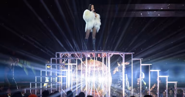 Autre temps fort incontestable : la prestation de Mark Ronson, honoré du prix de la contribution exceptionnel pour la musique. Pour célébrer son parcours, il a proposé un medley de ses plus grands succès… avant de créer la surprise avec l’arrivée spectaculaire de Dua Lipa. La chanteuse est descendue du plafond de la salle, installée sur une immense boule disco lumineuse, avant d’interpréter avec lui Dance The Night et Electricity.